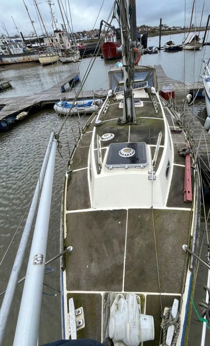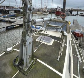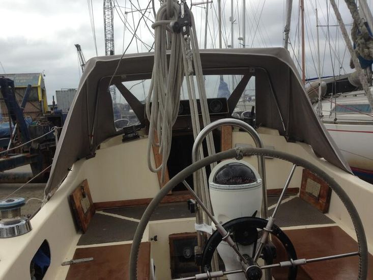 Wheel steering from a deep open aft self draining cockpit, All her lines lead back to the cockpit (she has self steering gear) .Decks are covered with the non slip Tracmarc.