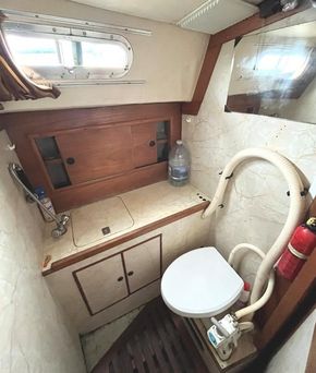 Two single berths (with infill makes up to a double in the forward cabin), Glazed forehatch over . Passageway with hanging wardrobe to port and a spacious Heads compartment to starboard with toilet shower, wash basin, Teak grating and flexible showerhead . Hot and cold water.