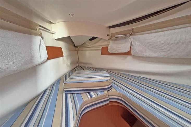 The accommodation offers up to five berths in a light and airy interior. Up forward, there is a V-berth with an infill, making a comfortable double. Stowage under and opening hatch to deck. Full width heads compartment with a Jabsco marine toilet to starboard and the washbasin opposite to port with a manually pump cold water supply.