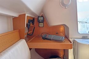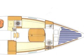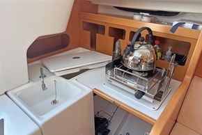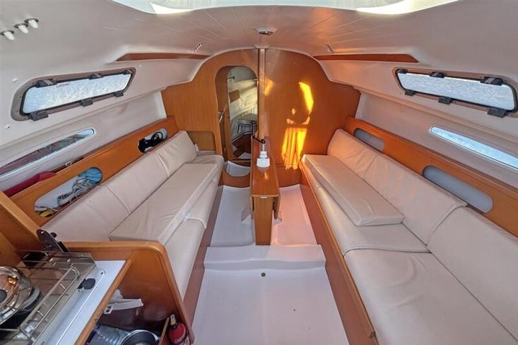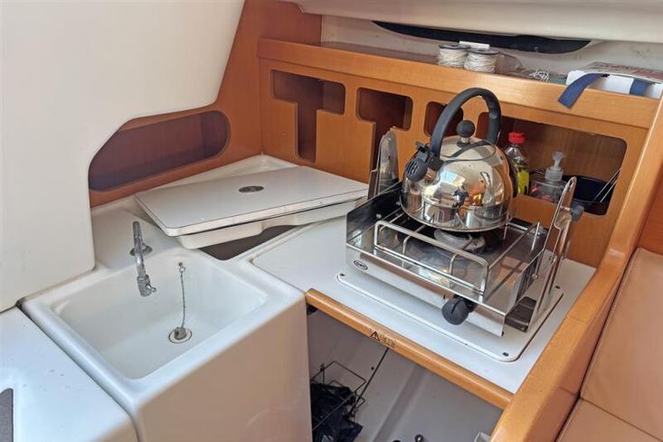 Moving aft into the saloon, there are two settees either side of a fixed table with drop leaf. The starboard berth pulls out to make a double. The galley to port with one burner hob and sink. Manually pumped water supply. Chart table to starboard. Opening portlights to port and starboard.