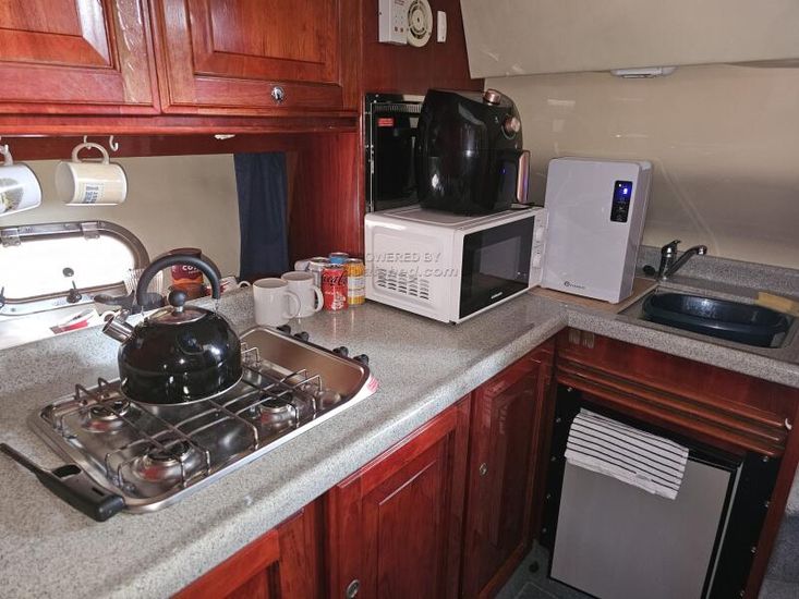 There is a good amount of space around the cabin table with a double seat at the helmsman position which can be reversed. The table can drop down to make a double berth. The galley is located to starboard with a double berth cabin opposite. Forward is the luxurious owners cabin with plenty of space and another double berth.