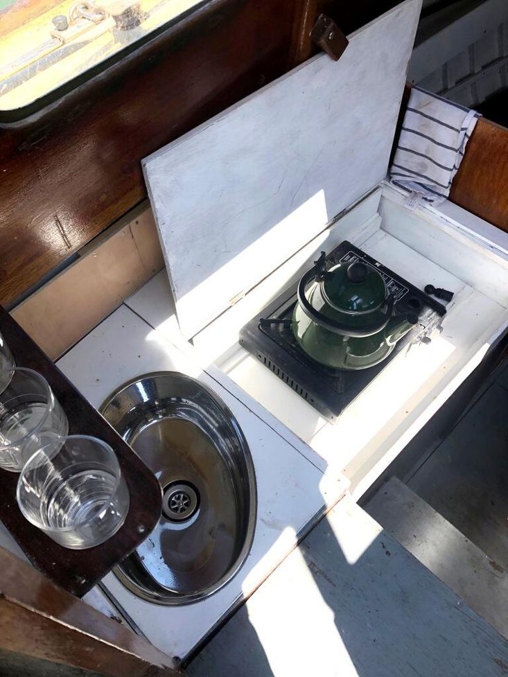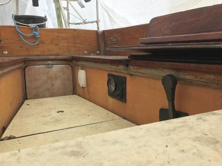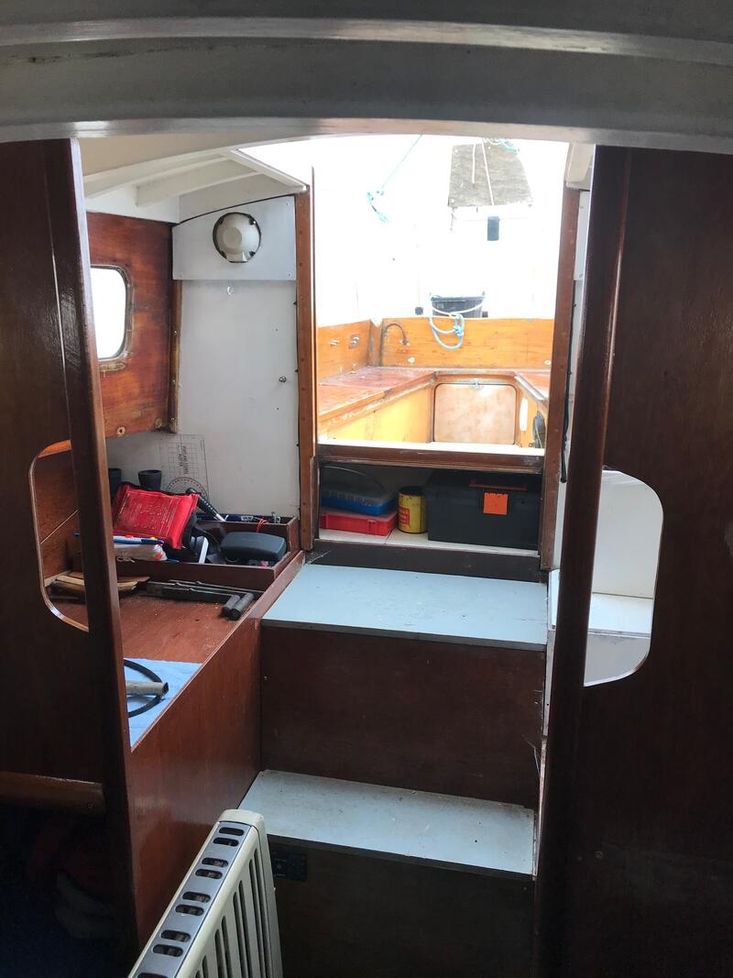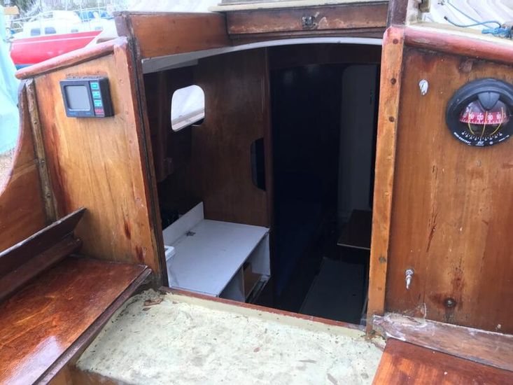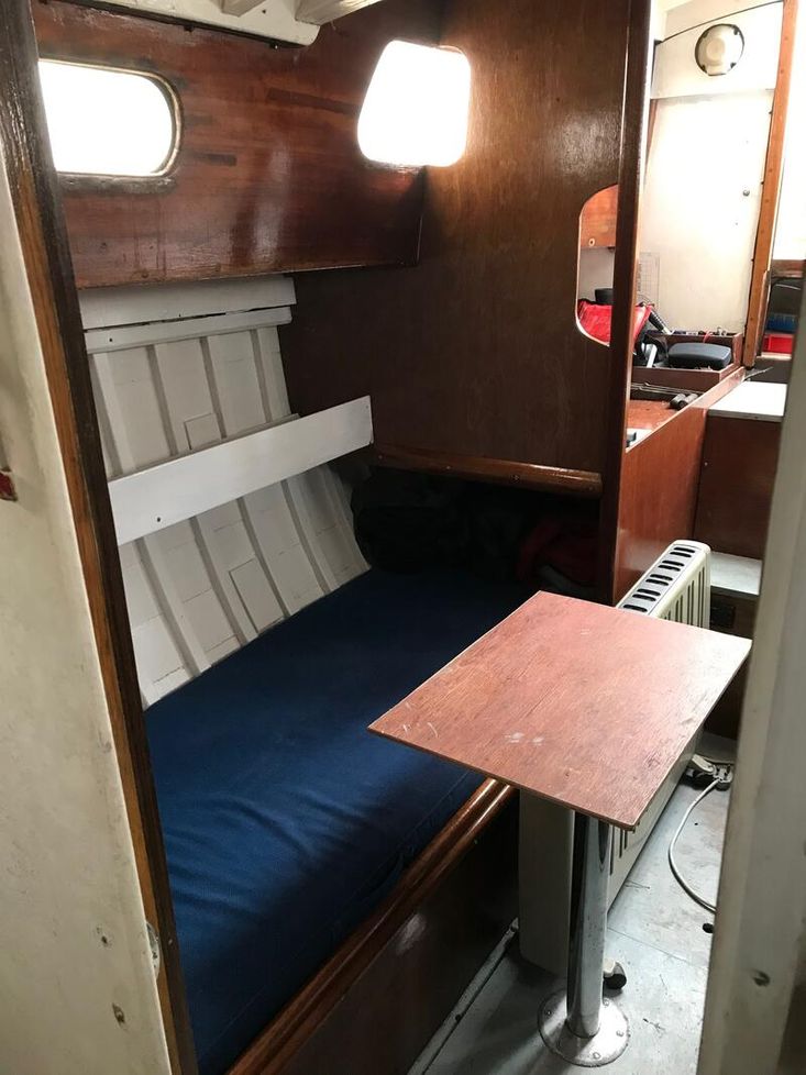A new deep open aft self draining cockpit, companionway into the cabin, either side is a small galley area and chart table, opposing. Forward two opposing settee berths with shelving behind a pedestal table stands between them. Separate heads compartment, forward of the mast deck bulkhead. Manually pumped Marine toilet, opposite a hanging locker. In fore peak there are 2 x single berths with deck hatch over. A forth berth has been created where there was once a pipe cot over sail stowage in the fore peak.