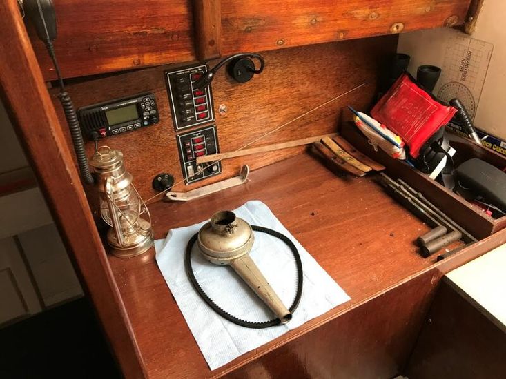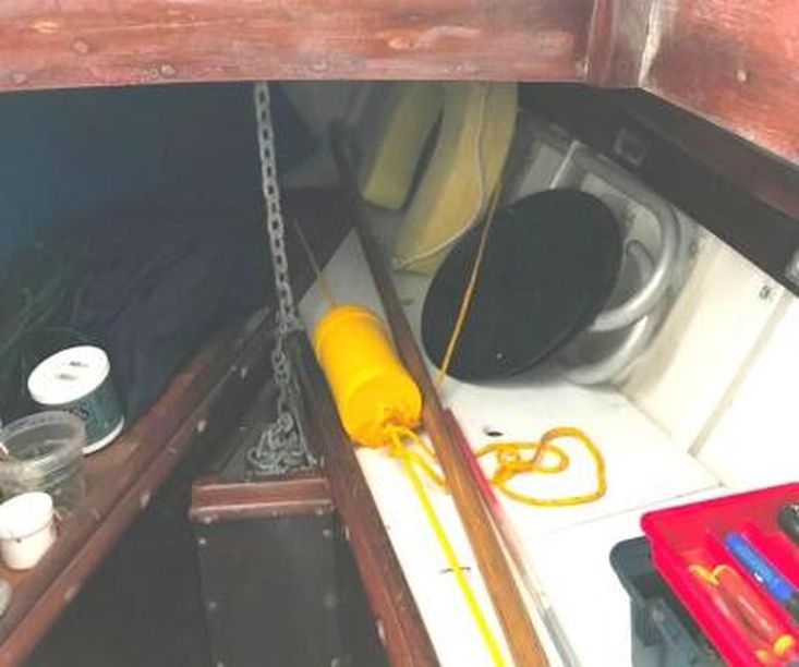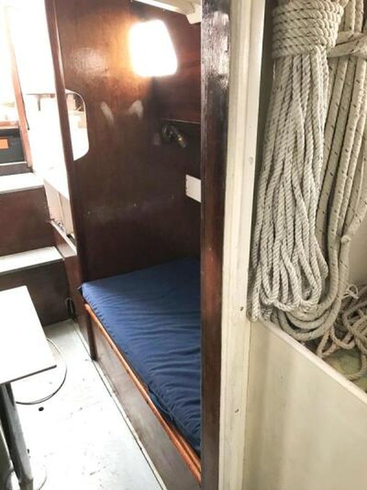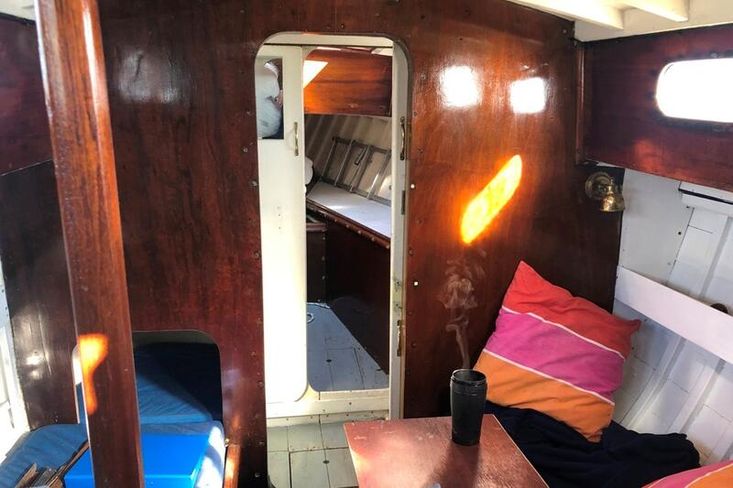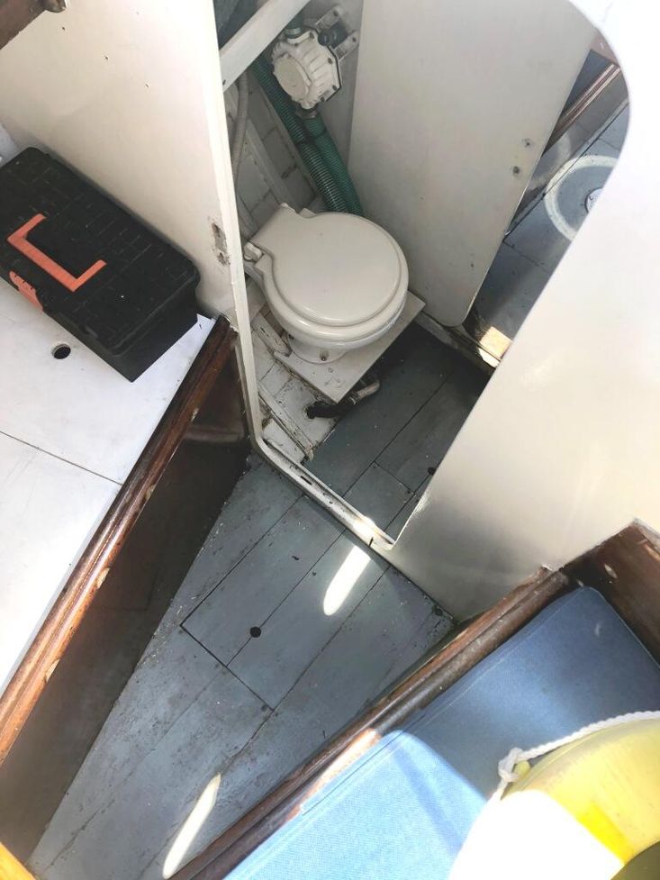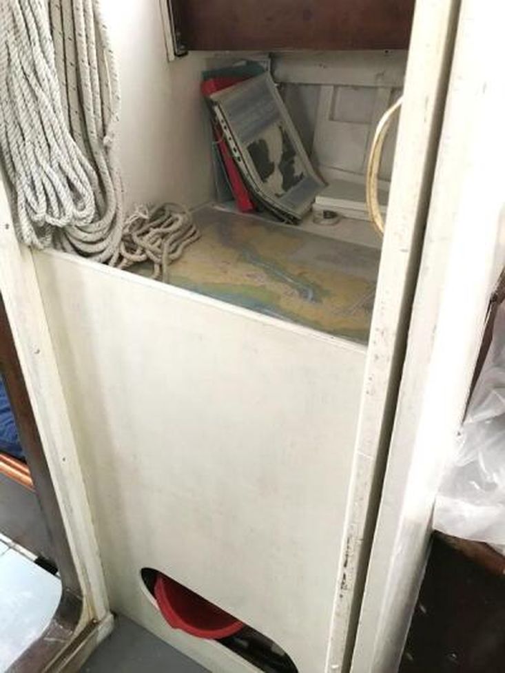 A new deep open aft self draining cockpit, companionway into the cabin, either side is a small galley area and chart table, opposing. Forward two opposing settee berths with shelving behind a pedestal table stands between them. Separate heads compartment, forward of the mast deck bulkhead. Manually pumped Marine toilet, opposite a hanging locker. In fore peak there are 2 x single berths with deck hatch over. A forth berth has been created where there was once a pipe cot over sail stowage in the fore peak.