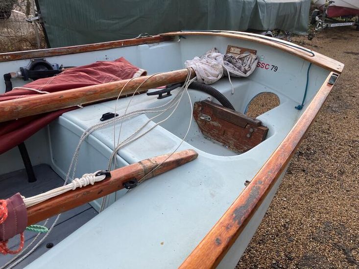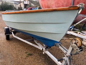 Original light blue GRP hull and deck. Teak gunwales/trim left bare and in good order.