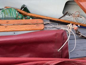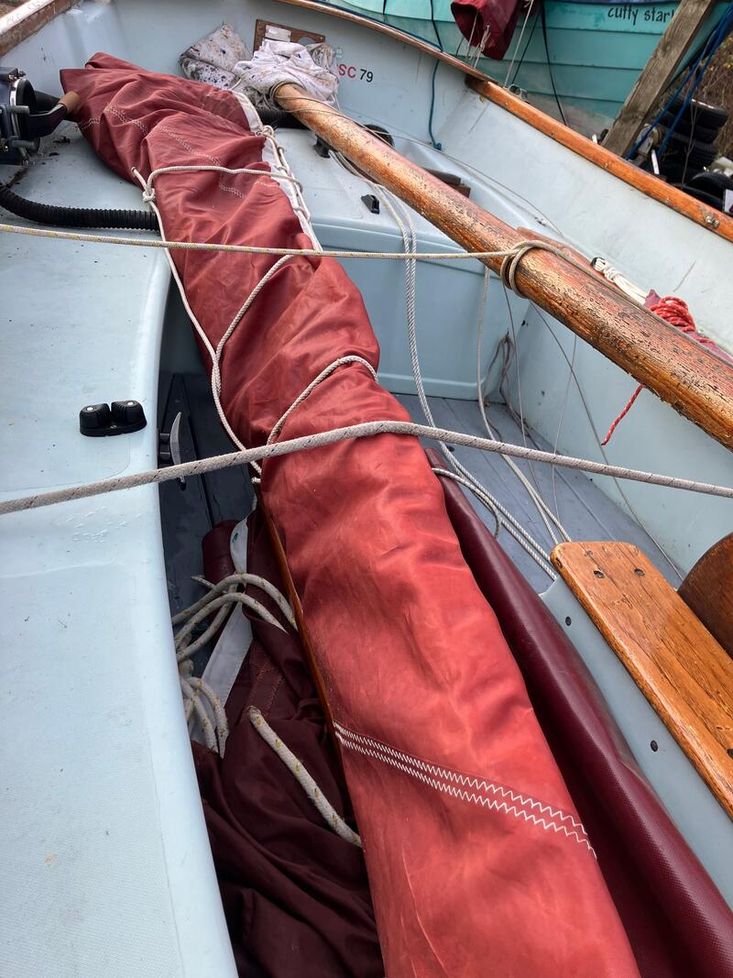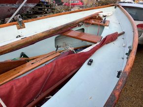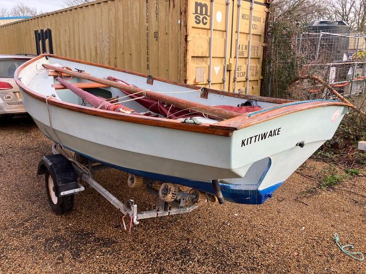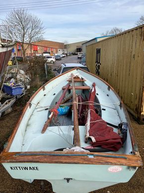 Kittiwake is a nice example of a Drascombe Dabber in original gelcoat. She has good sails, masts/spars, centreplate, etc. She benefits from having good covers, 4-stroke motor and Easy launch/recover road trailer. She would benefit from some re-varnishing.