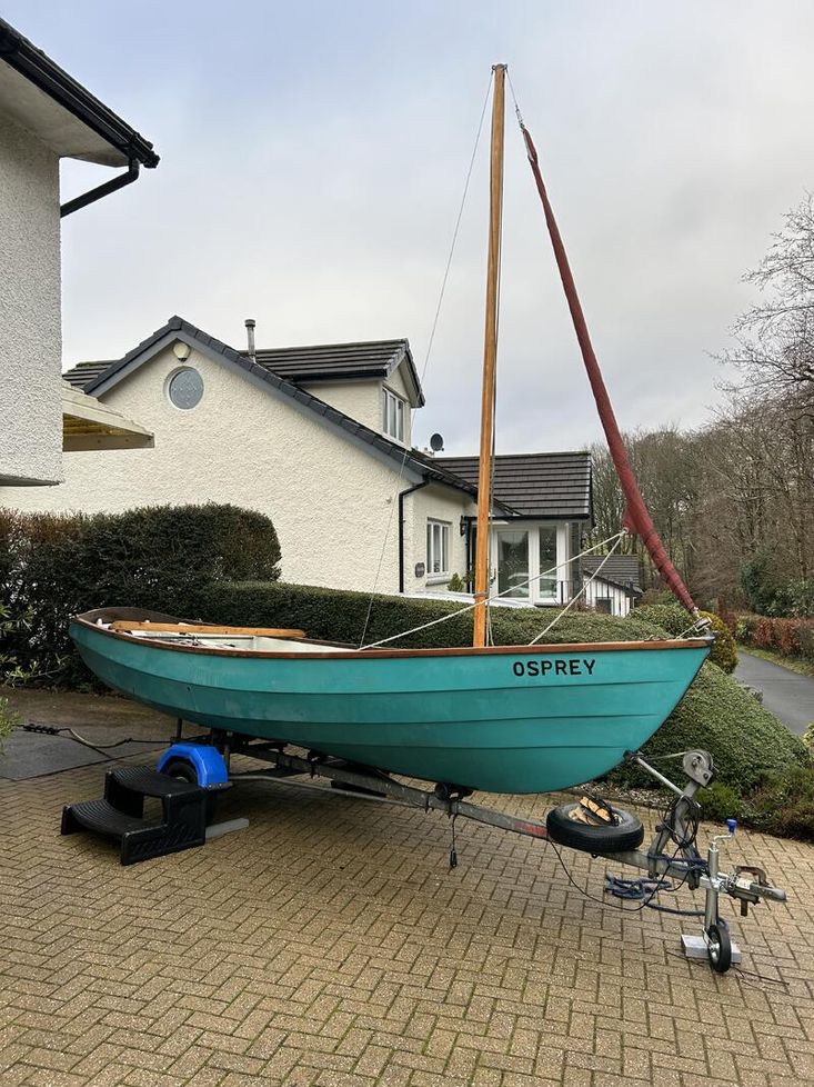 A traditional "Swallows and Amazon" Drascombe Lugger sailing Dinghy with road trailer.