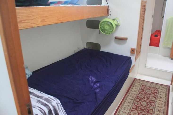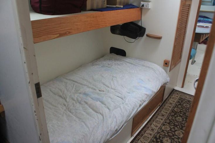 The fully enclosed pilot house offers all-weather protection, great visibility, and easy access to safety equipment and navigation instruments. Below deck, there’s a spacious accommodation area, currently featuring a large ensuite master cabin aft and three other cabins, which could be modified to add extra berths if needed. The forepeak is set up as a workshop but could easily be converted back into a cabin for additional sleeping space.