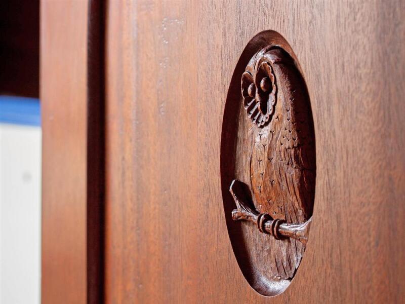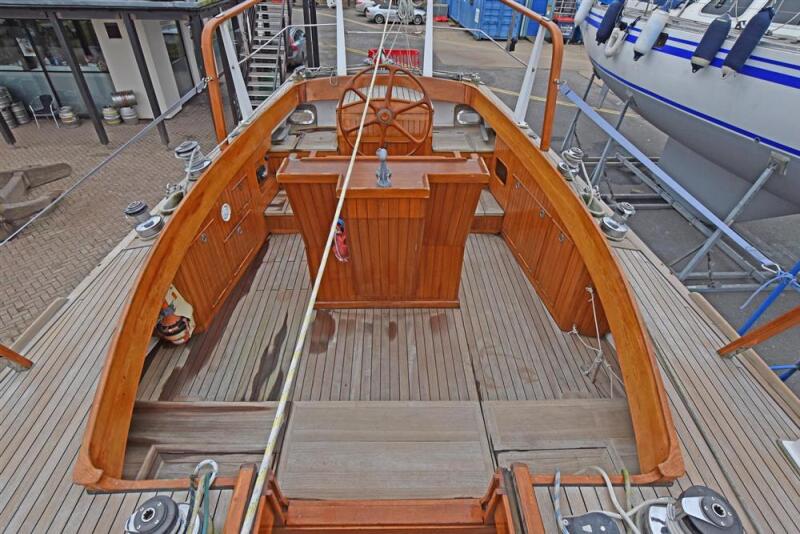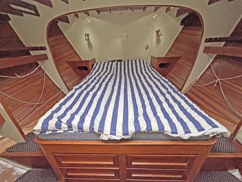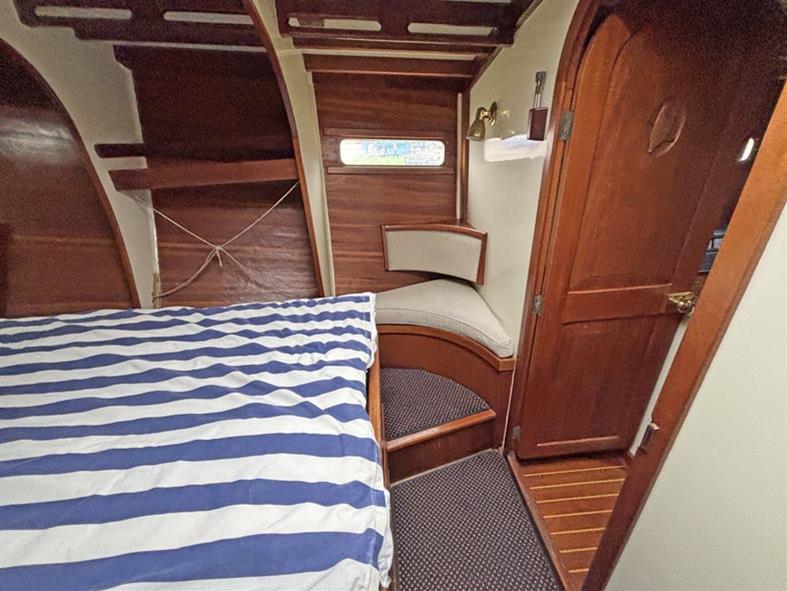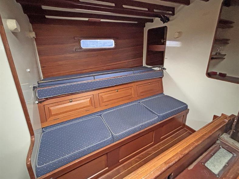 Offering up to 9 berths in a spacious and well laid out interior, furnished in acres of beautiful solid mahogany including sea friendly hand holds, deck beams and exquisite hand carvings throughout. Up forward there is a large double island berth, with good storage provided by drawers under the berth, and a large hanging locker and a couple of shelves with reading lights. There is plenty of natural light and ventilation via the deck opening hatch. There is a single settee in the starboard quarter.