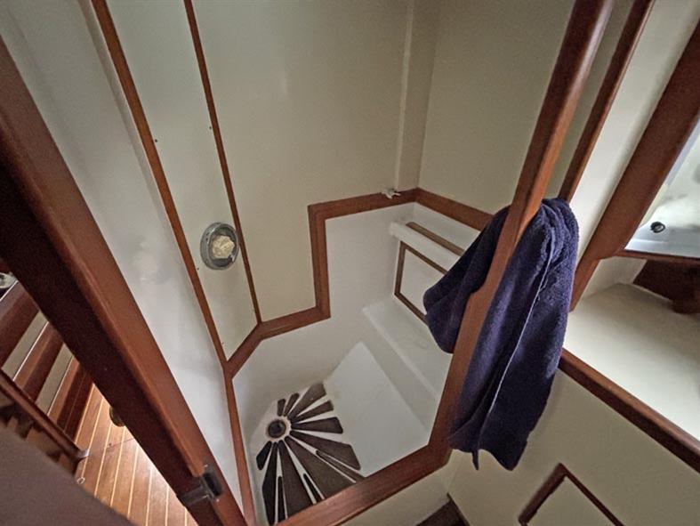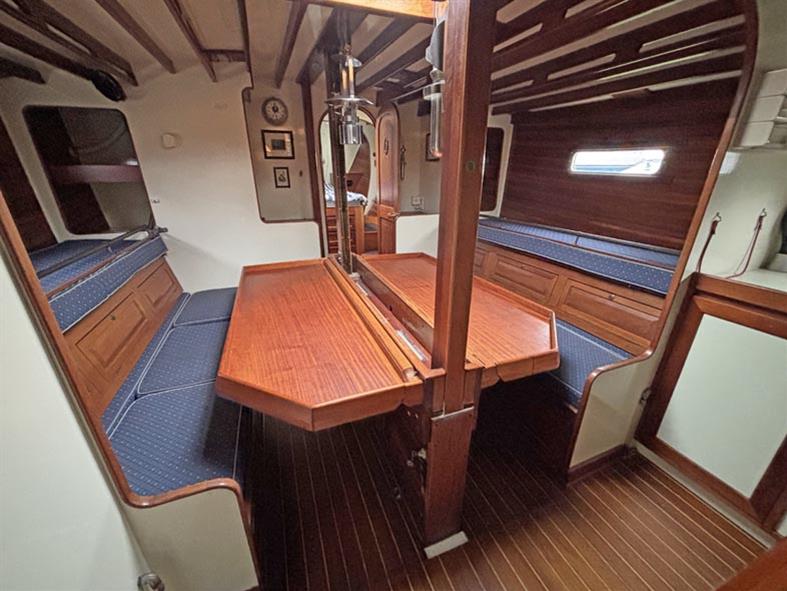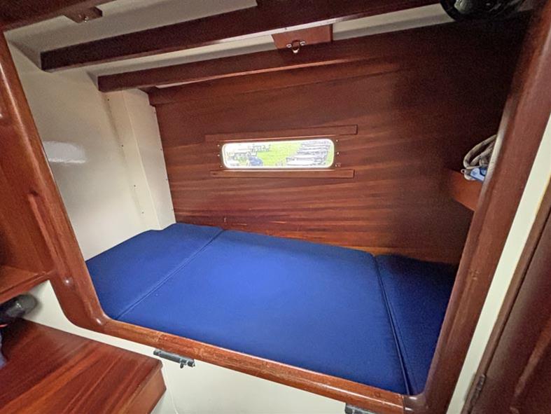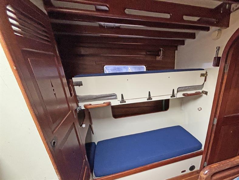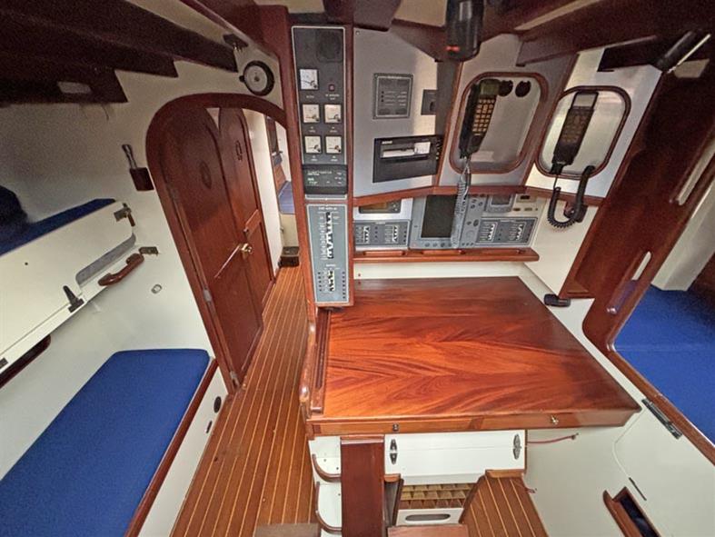 Opposite to port, located off of the walk through, is the separate heads compartment with a duel electric and manual Lavac marine toilet, basin with a pressurised hot & cold water supply. Shower compartment with an electric pump out. Moving aft through the walk through you come into the aft cabin and companionway. To centre there is a large forward facing chart table with electrical distribution panel and some navigation equipment. To port you have single bunk beds and a hanging locker. To starboard there is another single navigator’s berth. Eberspacher diesel fired cabin heating. Blue upholstery. Approximately 540 litres of fresh water, in two 270 litre stainless steel tanks.