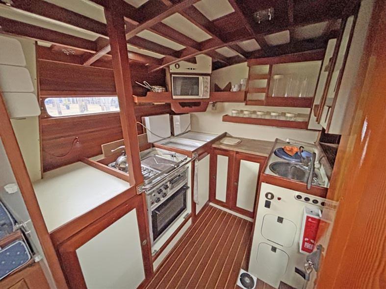 Moving aft you come into the large saloon area which has two single settee berths either side of a double drop leaf table to centre. The table is made around the forward lifting keel case. Outboard of both settee berths are comfortable pilot berths. Storage is again provided by drawers and lockers around the saloon. The well laid galley is to starboard, with a Taylor 041 2 burner gas oven & grill. Two stainless steel sinks with a pressurised hot & cold water supply. Manually pumped cold water supply. Top opening fridge and freezer. Microwave. There is plenty of stowage around the galley, provided by shelving and deep lockers.