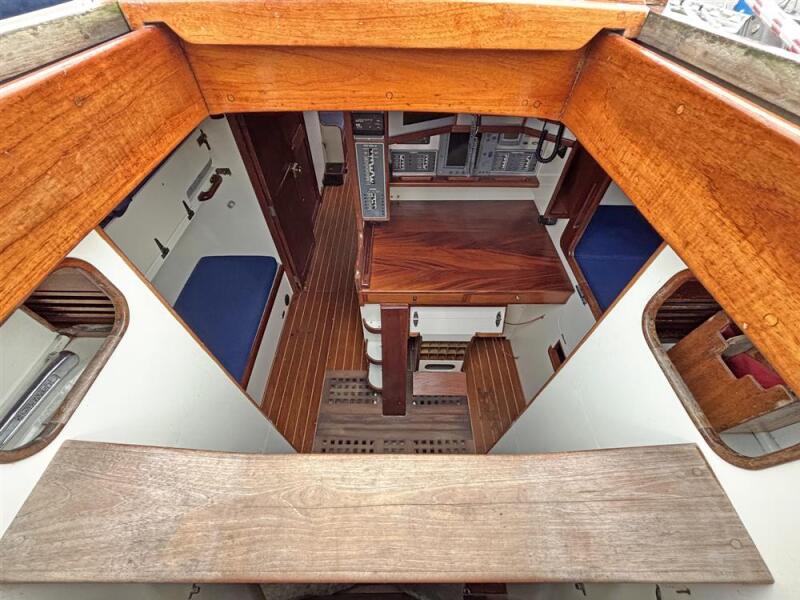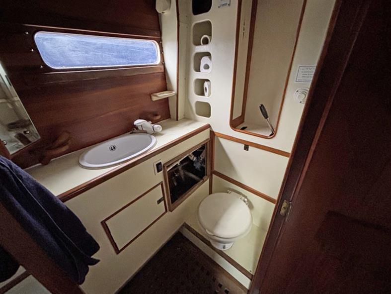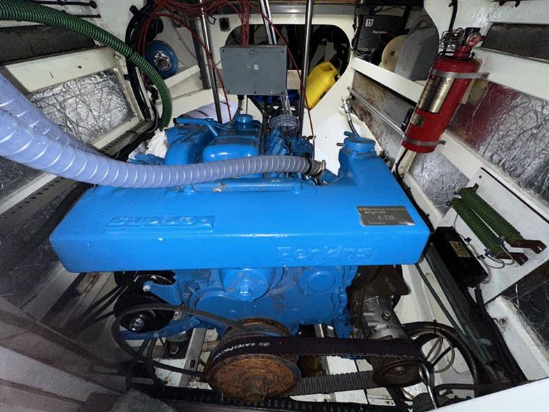 Located under the cockpit sole, with good access from forward and aft is the Perkins 4.236 marine diesel engine fitted in 1990. 81hp, 4 cylinder, naturally aspirated, fresh water cooled via a heat exchanger. Offset Shaft via ZF 25 M gearbox to a 3 bladed Bruntons Autoprop. Ambassador rope cutter. Single lever controls. Electric start. Two stainless steel fuel tanks which hold approximately 250 litres each.