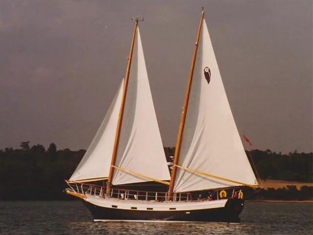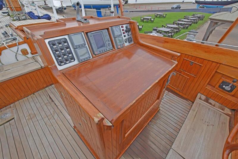 Freedom rigged, unstayed & raked wishbone schooner. Keel stepped and laminated Douglas fir mast and booms. Douglas fir bowsprit (new 2023). Terylene running rigging. Headsail controlled with Douglas fir jib-boom. Central staysail. Two Lewmar 30 control line winches (one on each mast). One Lewmar 40 halyard winch. One Lewmar 46 halyard winch. Two Lewmar 40 sheet winches. Two Lewmar 46 sheet winches.