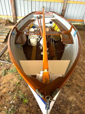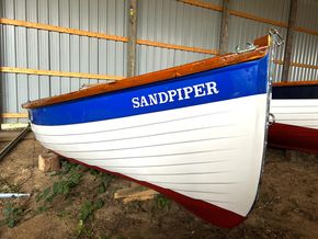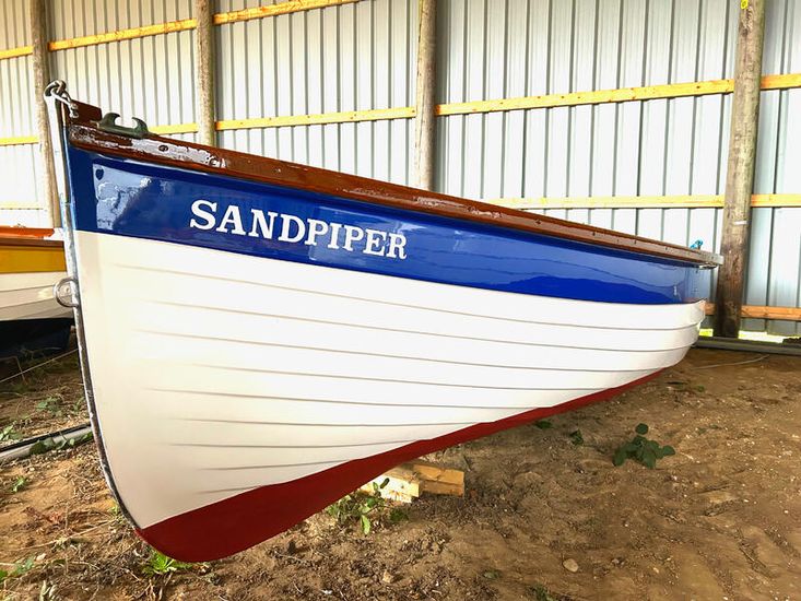 A chance to buy a beloved Stiffkey Cockle, Sandpiper is serviced and ready to go for the 2026 season. The Stiffkey Cockle is a well proven, pretty GRP simulated clinker with an abundance of hardwood fitting out including gunwales, seats, rudder, tiller and thwart. Built from 6oz GRP the Cockle is a sturdy, stable, spacious and above all simple boat to sail and handle. She has a gunter rig with a single halyard and furling jib on a Wykeham Martin system and tan sails. The hull is complete with internal buoyancy, stainless steel tabernacle and a centreplate giving a draft of 7" with plate raised and 2'6" when lowered. She weighs 300kg and is easily trailer-able, the mast lowering with ease.