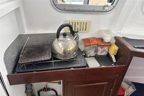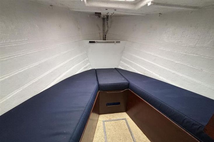 Simple interior with a V-berth in the bow with blue cushions. Deck opening hatch Helm position with engine controls, electrical distribution panel and navigation equipment. Small linear galley area to port with 2 burner gas hob. Blue