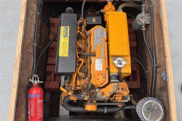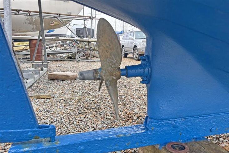 Located under the cockpit sole is the Vetus M4.17 marine diesel engine. 40hp, four cylinders, naturally aspirated. Fresh water cooled via a heat exchanger. Single lever controls. Electric start. Shaft drive to a three-blade bronze propeller. Annually serviced (last serviced February 2026). Approximately 728 engine hours.
