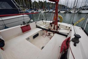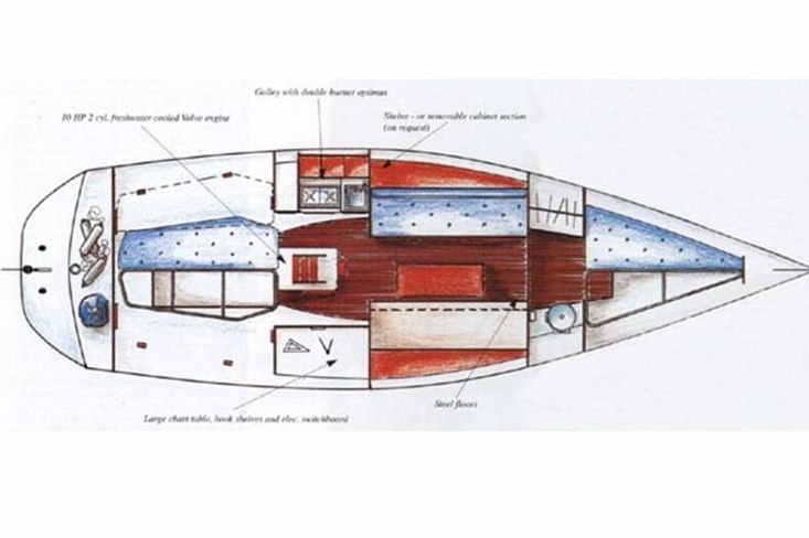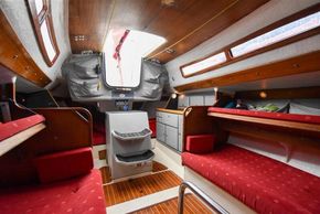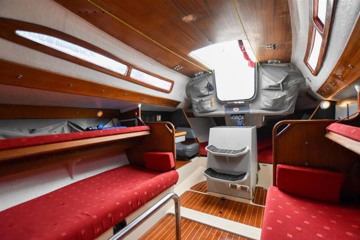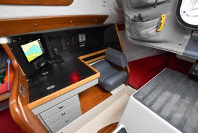 The forward-facing chart table is opposite to starboard, giving a good size chart table with navigation equipment, electrical distribution panel, internal stowage and drawers under. Chart table seat trimmed in grey leather. Large aft berth extending across the whole area under the cockpit.
