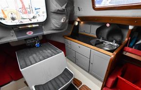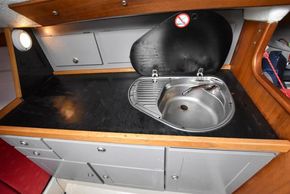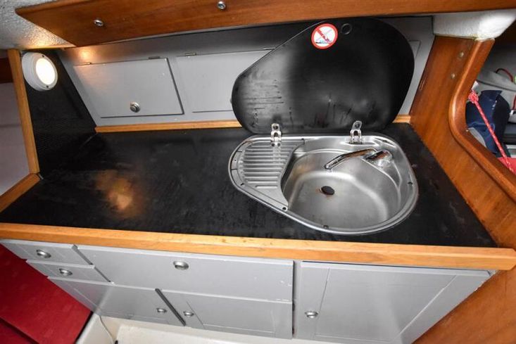 The linear galley is to port, which was refitted in 2015 giving ample work surfaces, cupboards and drawers. Stainless steel sink unit with integrated single burner gas hob and hinged glass cover.