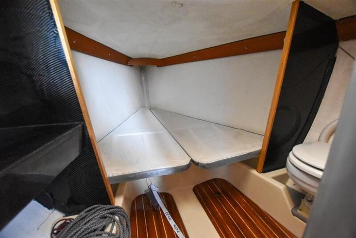 Stepping aft into the saloon, there are two single settee berths to port and starboard with stowage underneath.
