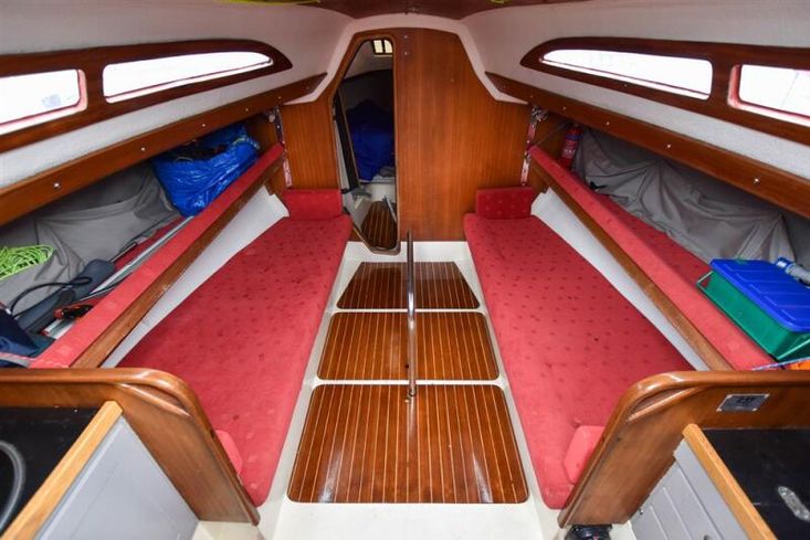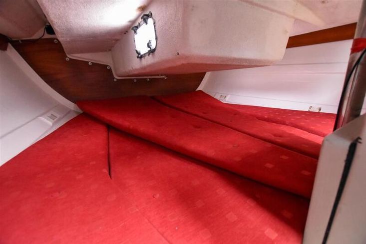 Offering up to 6 berths in a neatly finished interior, with red velour upholstery and teak & holly soleboards. Up forward, there is a double V-berth with stowage under. Jabsco marine toilet to starboard and a handy stowage shelf and locker opposite to port.